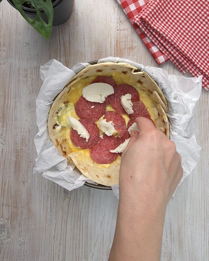Leg de piadina in de vorm, laat de randen omhoog (indien nodig maak kleine insnijdingen aan de zijkanten om de piadina beter te laten hechten aan de wanden).