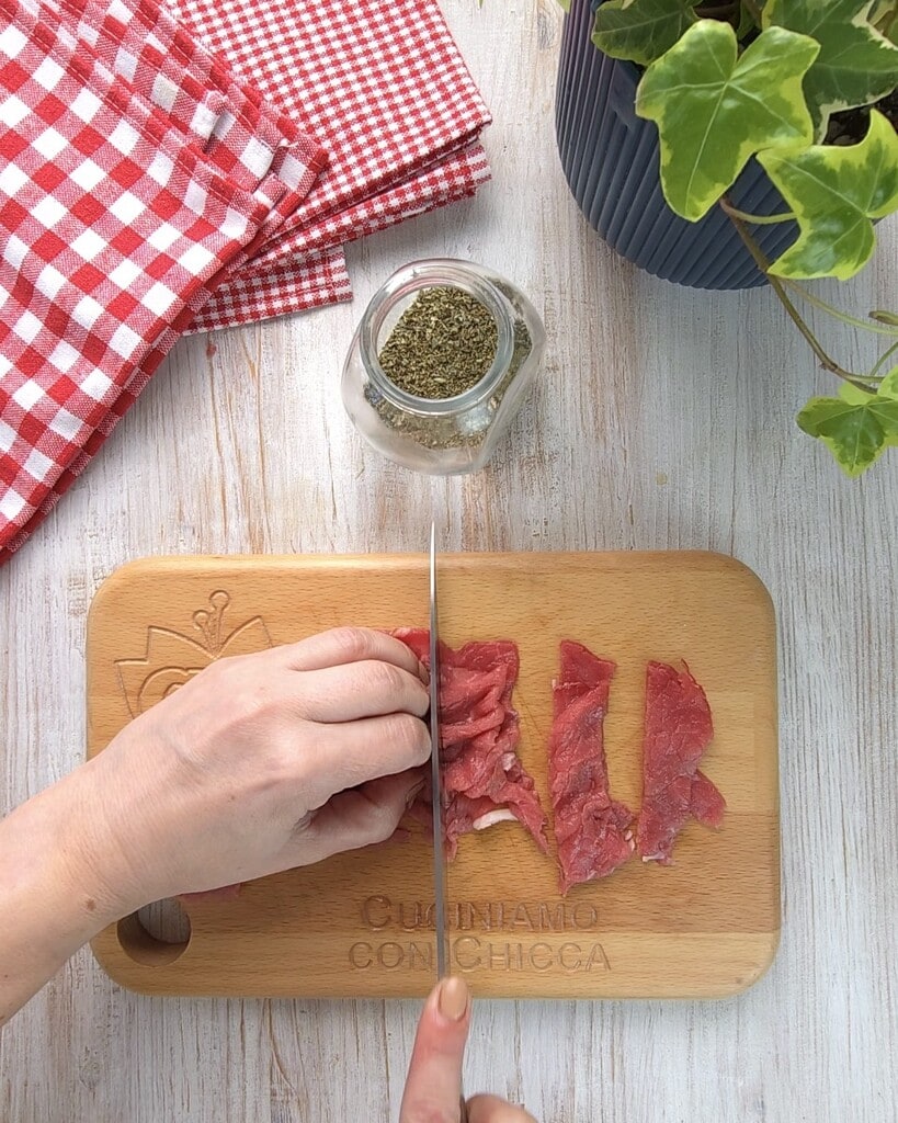 Neem het vlees en snijd het in reepjes met een scherp mes.