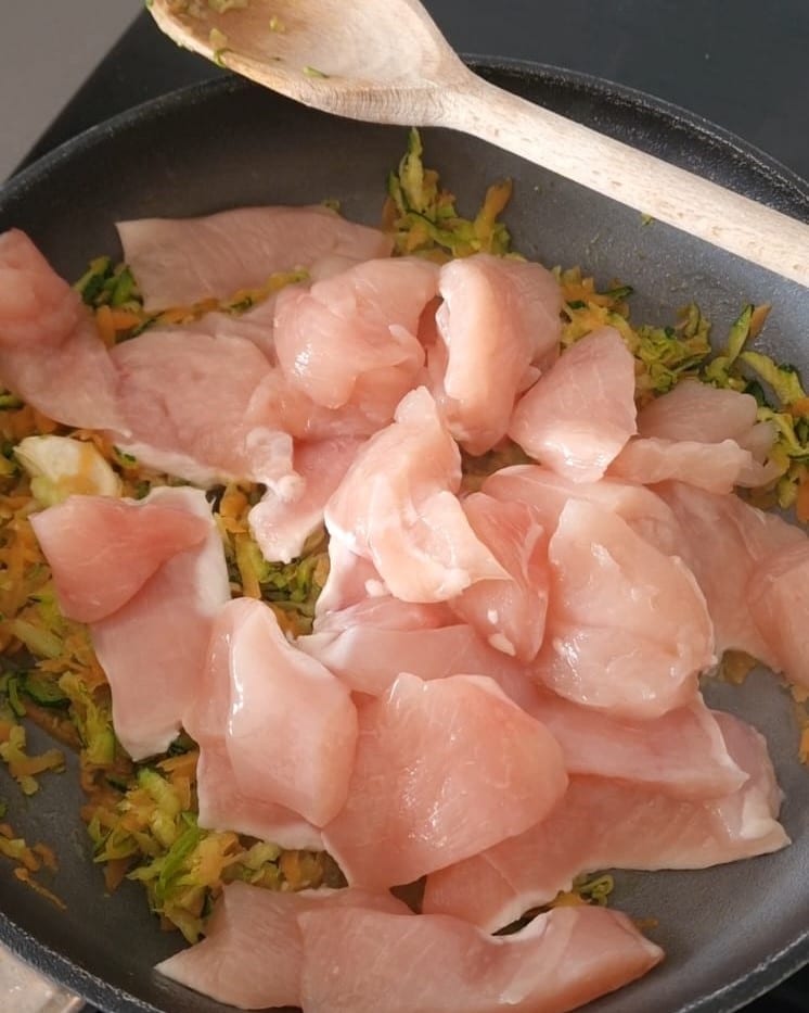 Voeg de kipfilet toe, kook nog 5 minuten verder, zout en peper naar smaak.