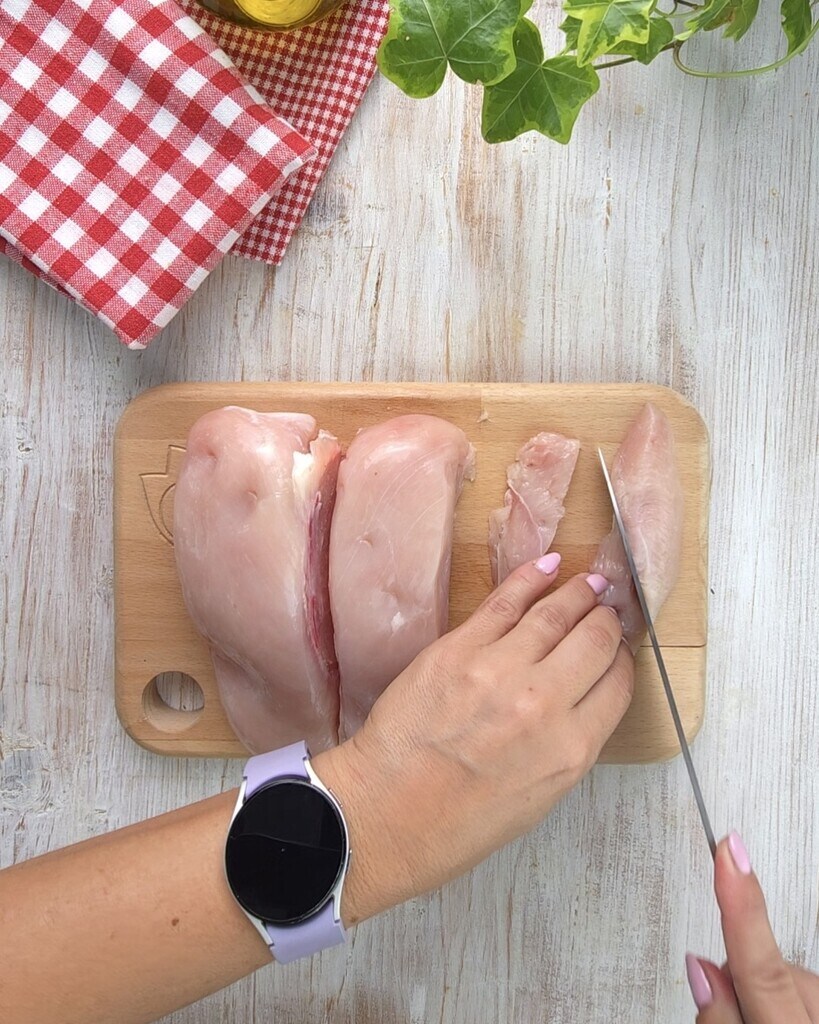 Met een scherp, glad mes snijd je het vlees in stukjes of reepjes, zorg ervoor dat elk stuk dezelfde maat heeft.