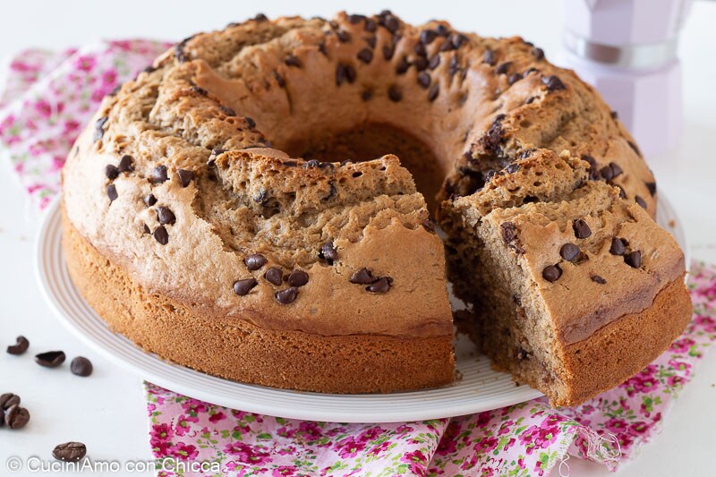 Koffiecake geurige en uiterst zachte is een heerlijke kastcake! Als je van koffiedesserts houdt, probeer dan ook de ricotta en koffietaart en de koffietruffels zo romig en onweerstaanbaar! Het recept van vandaag is echt snel, we hebben de klassieke ingrediënten nodig: eieren, bloem, suiker en koffie, het is zonder boter, daarom blijft het langere tijd zacht. Aan het deeg heb ik ook chocoladedruppels toegevoegd om het nog lekkerder te maken, natuurlijk kun je ze weglaten als je ze niet lekker vindt.