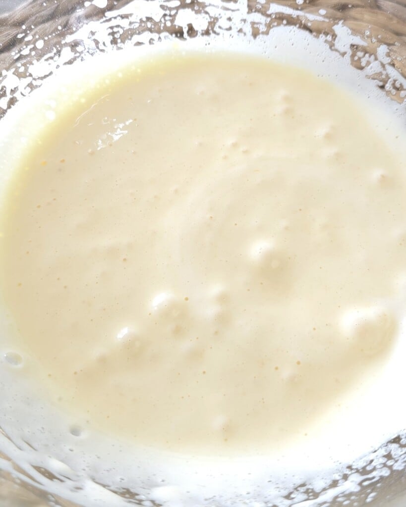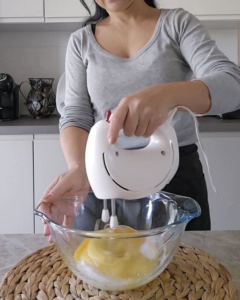 Mix goed met een elektrische mixer gedurende ongeveer 5 minuten of totdat de eieren schuimig worden.
