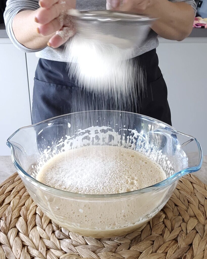 Giet de gezeefde bloem, blijf roeren en begin de bloem en het bakpoeder op te nemen.