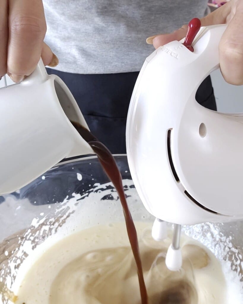Ga verder met de mixer en voeg de olie en de koffie op kamertemperatuur toe.