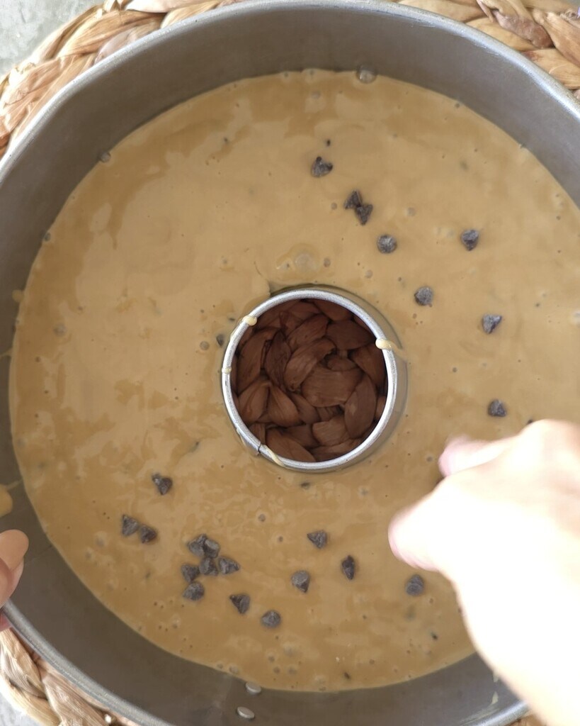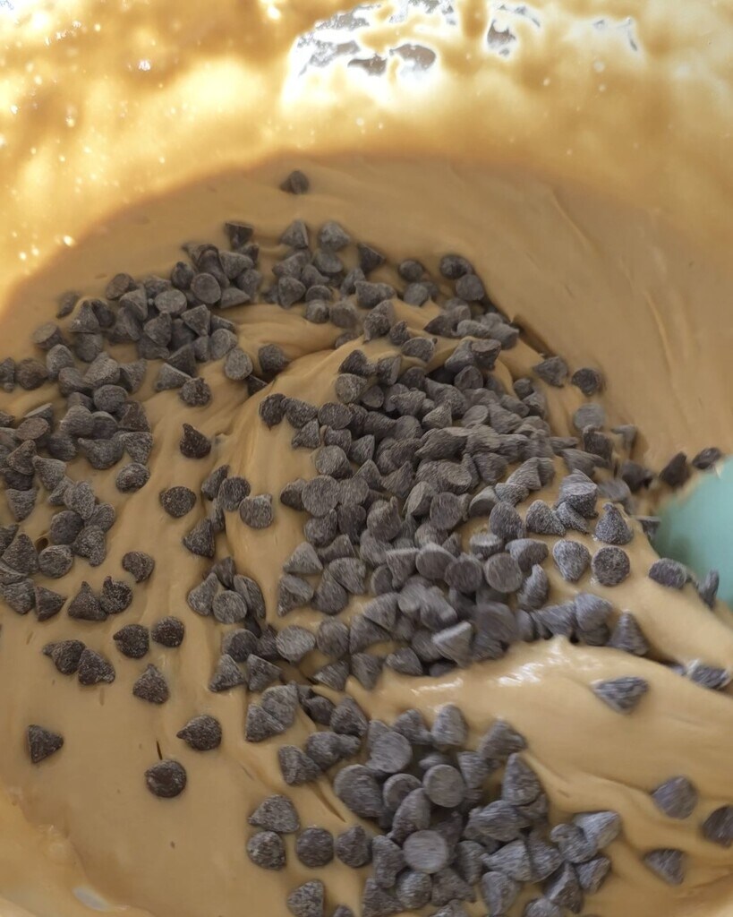 Als laatste ingrediënt voordat je het in de oven doet, voeg je de eerder bebloemde chocoladedruppels toe.
