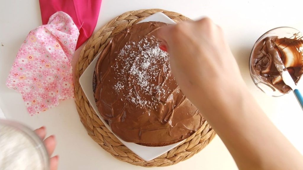 Zodra de taart is afgekoeld, versier deze met nutella en geraspte kokos.