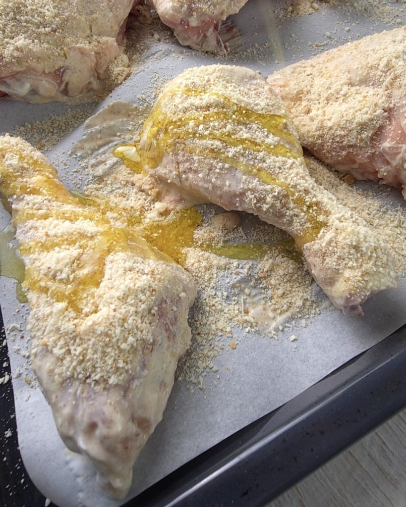 In een apart kommetje meng je het paneermeel en Parmezaanse kaas, vervolgens royaal over de kip strooien voor de gratin.