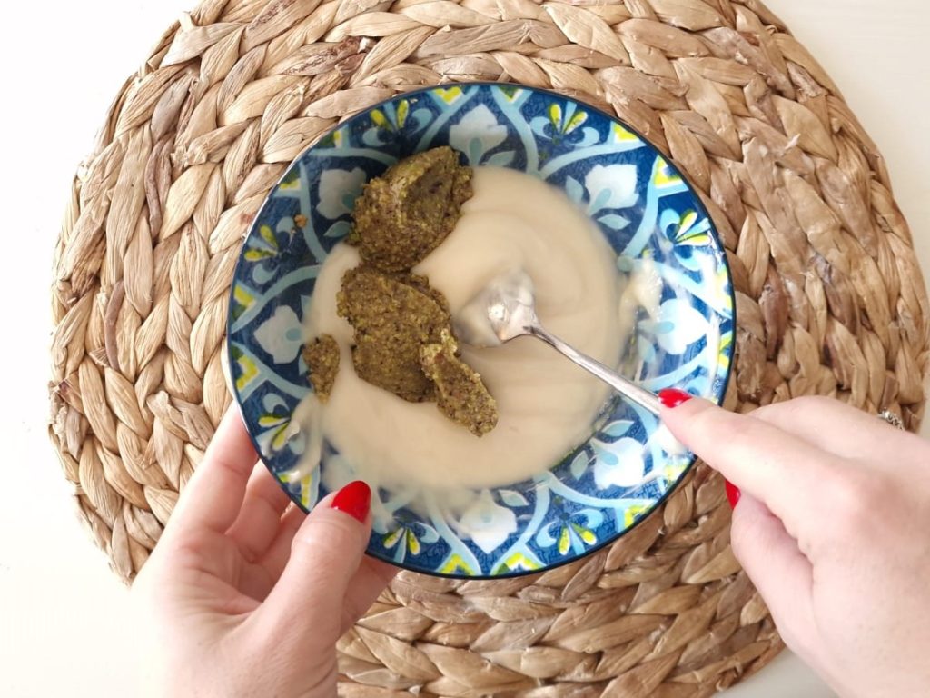 • Voeg de pistachepesto toe aan de bechamel en meng goed.