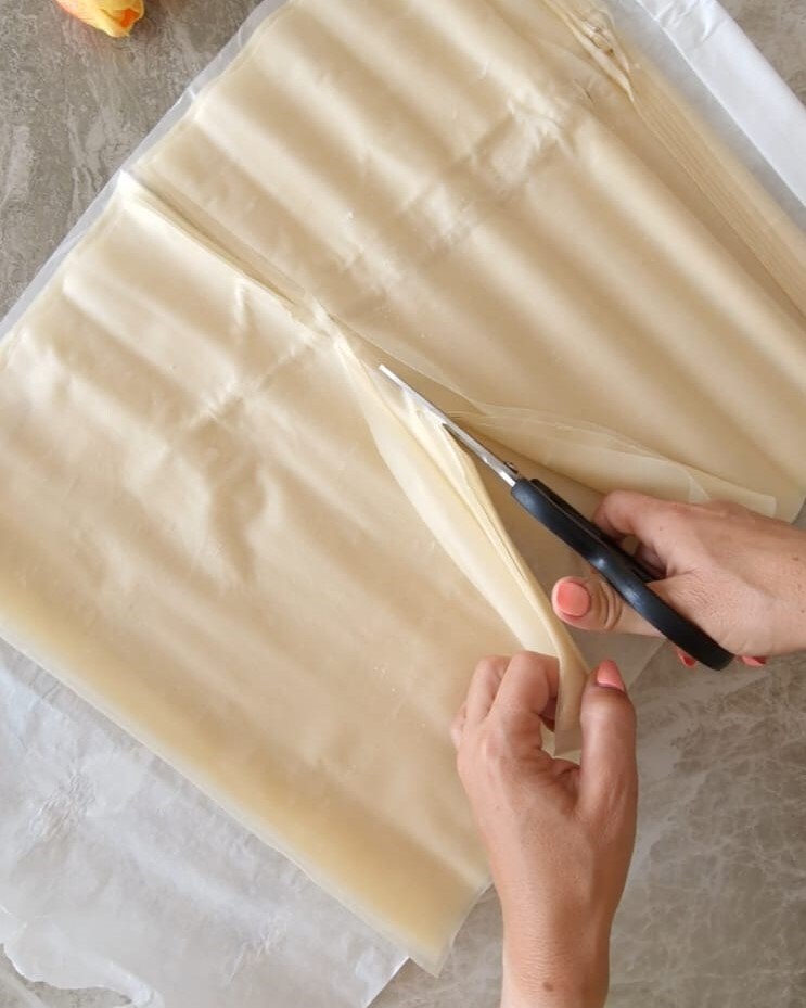 Vul met de crème en herhaal dan nog twee lagen tussen crème en filodeegbladen.