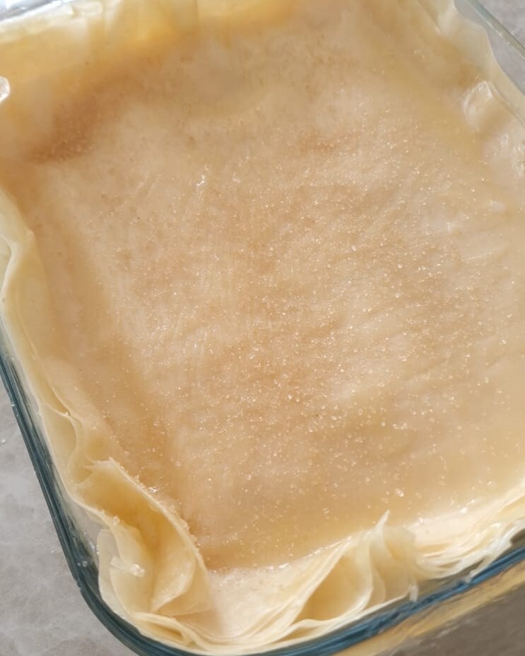 Smeer nu met de gesmolten boter een bakvorm van 30×20 cm goed in en leg er 2 vellen filodeeg op.
