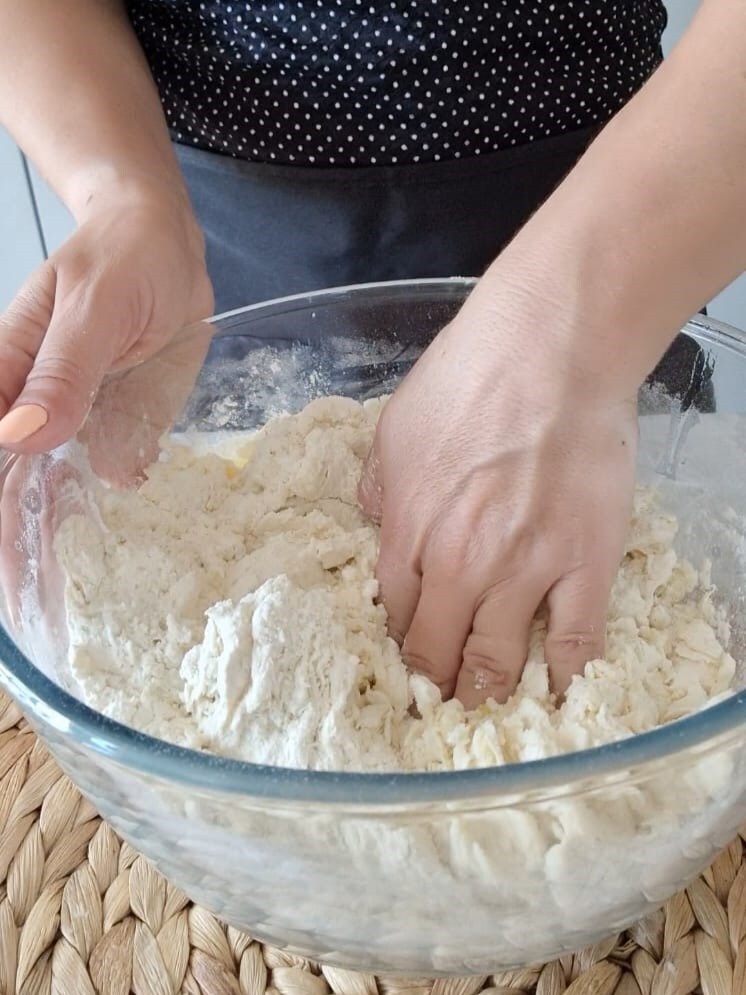 Kneed alles goed met de hand of met de keukenmachine. Vorm een bal en laat deze afgedekt met huishoudfolie ongeveer 15 minuten rusten.