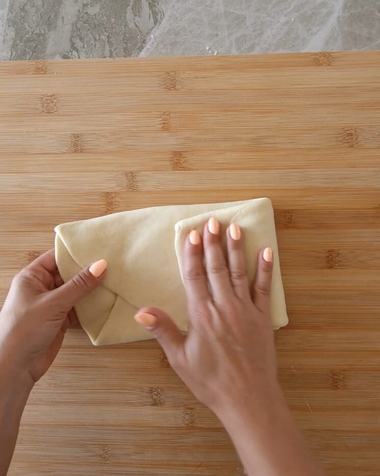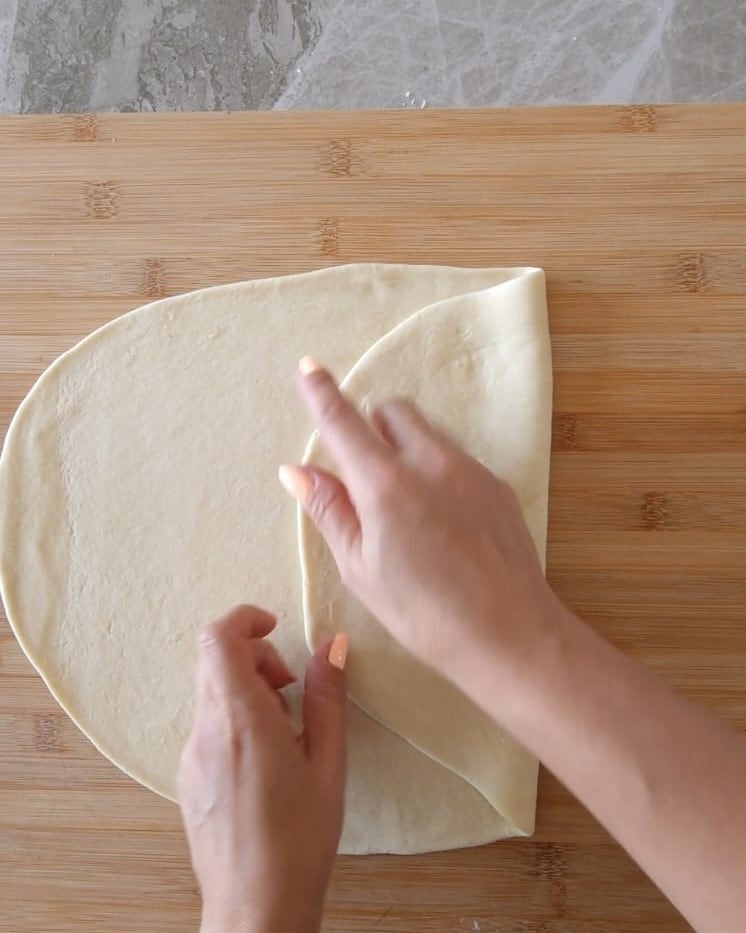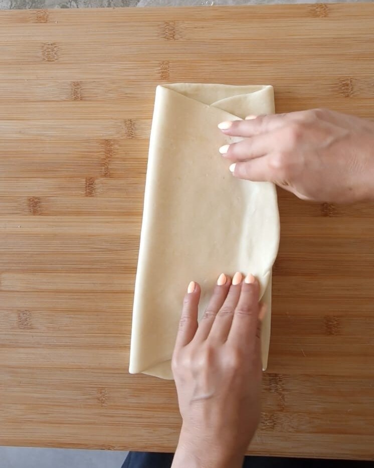 Maak nu de vouwen, door de delen van de schijf op elkaar te leggen, rol opnieuw uit met de deegroller en herhaal deze handeling twee keer.