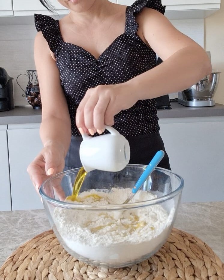 Doe de bloem in een grote kom, voeg dan het zout, het water en de olie toe.