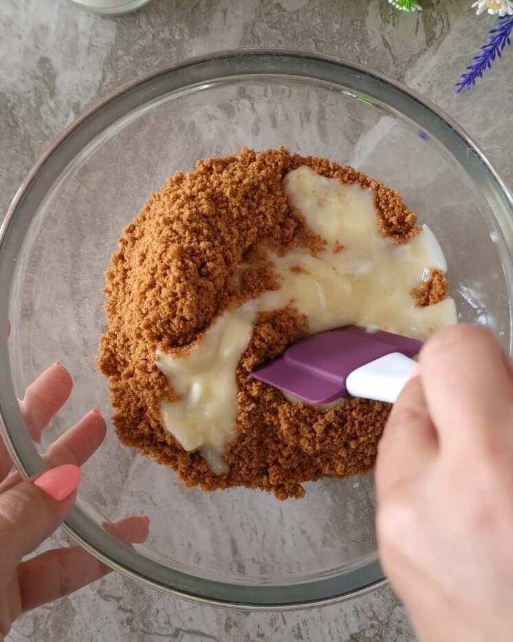 • Begin met het verkruimelen van de koekjes met een mixer, voeg vervolgens beetje bij beetje de gesmolten boter toe en meng goed