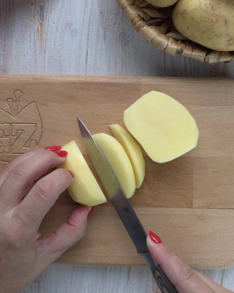 Schil de aardappelen en snijd ze vervolgens in partjes.