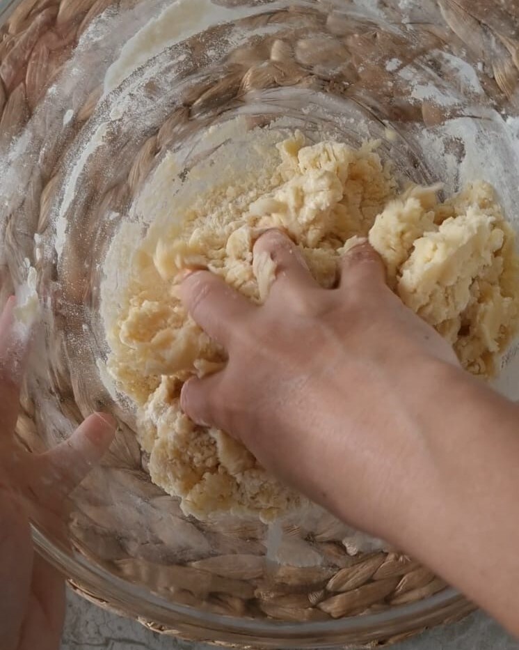 • Ga door met het beetje bij beetje toevoegen van de gezeefde bloem en bakpoeder, meng met de handen om kruimels te vormen.