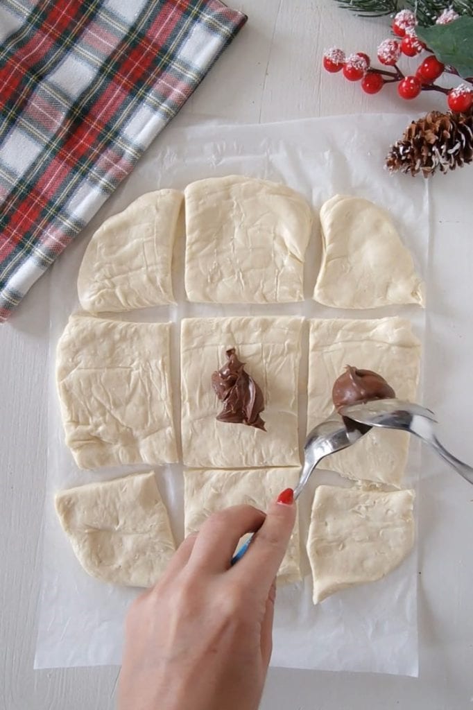 Rol het kant-en-klare pizzadeeg uit en verdeel het in vierkanten, vul vervolgens elk vierkantje met een theelepel Nutella.