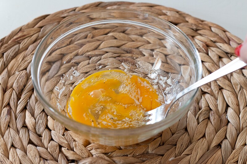 Klop in een kom de eieren met zout, peper en een snufje geraspte kaas.