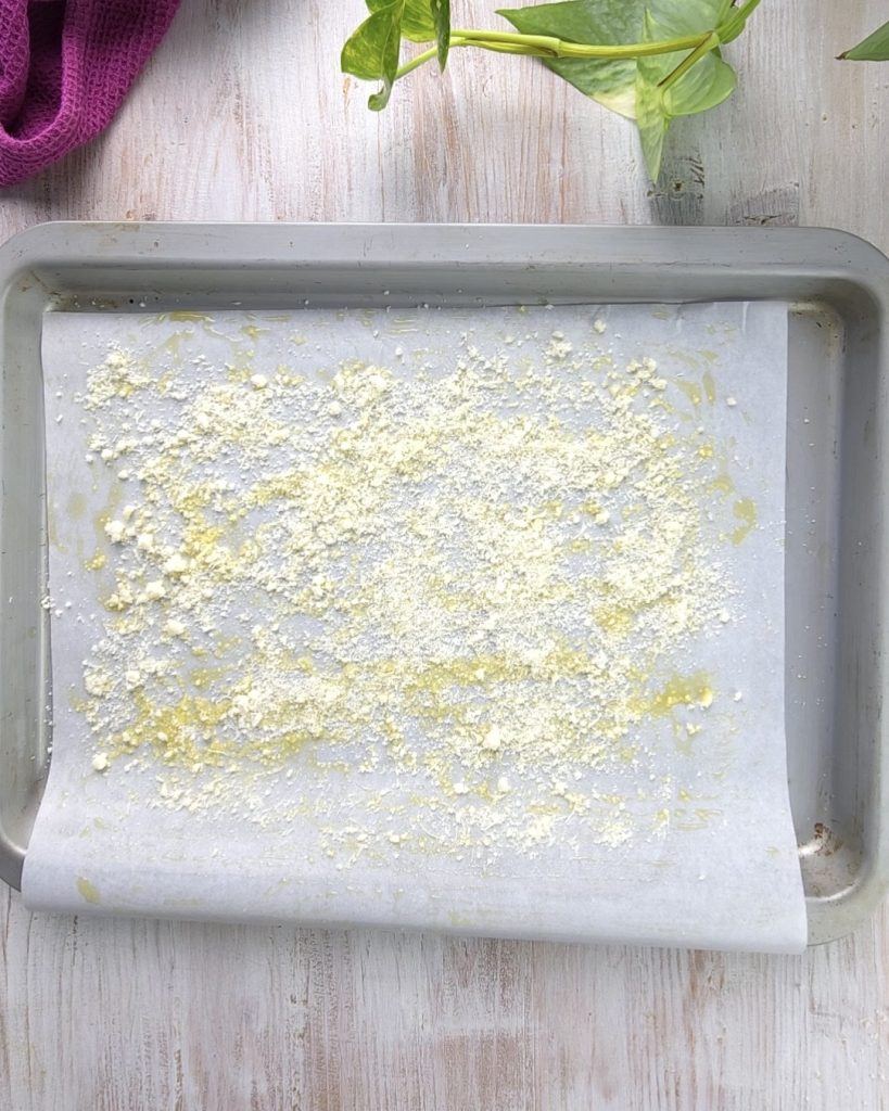 • Neem een bakvorm en bedek deze met bakpapier, olieer dan het vel goed en strooi de oppervlakte met geraspte Parmezaanse kaas, rozemarijn en oregano.