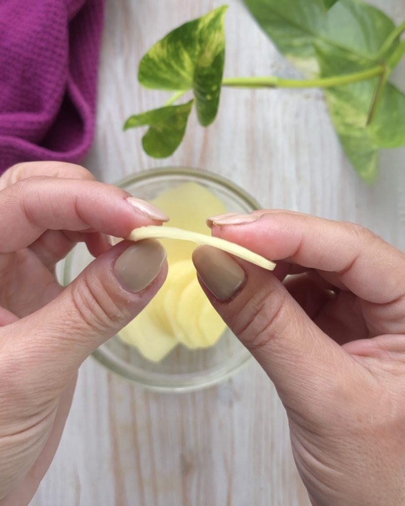 • Schil de aardappelen en snijd ze heel dun, ongeveer 3-4 mm. Snijd ze met de mandoline of de snijmachine.