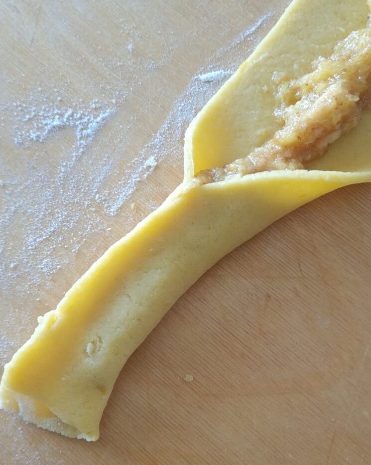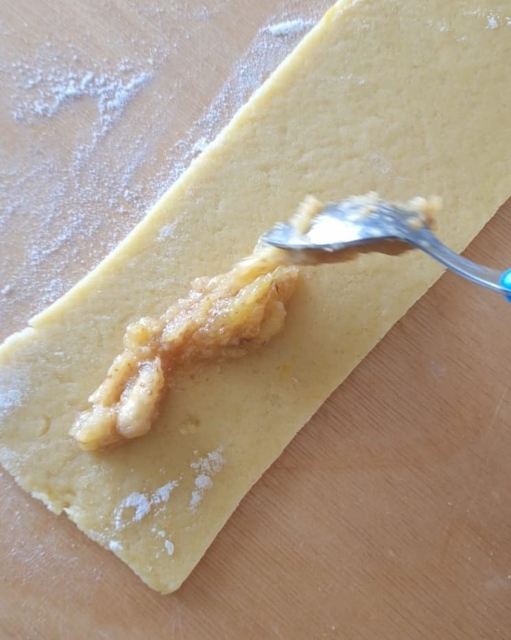 Neem het mengsel en plaats het op de eerste strook, laat een paar cm van de rand vrij, vouw dan de strook over zichzelf heen, zodat je een gevulde rol krijgt.