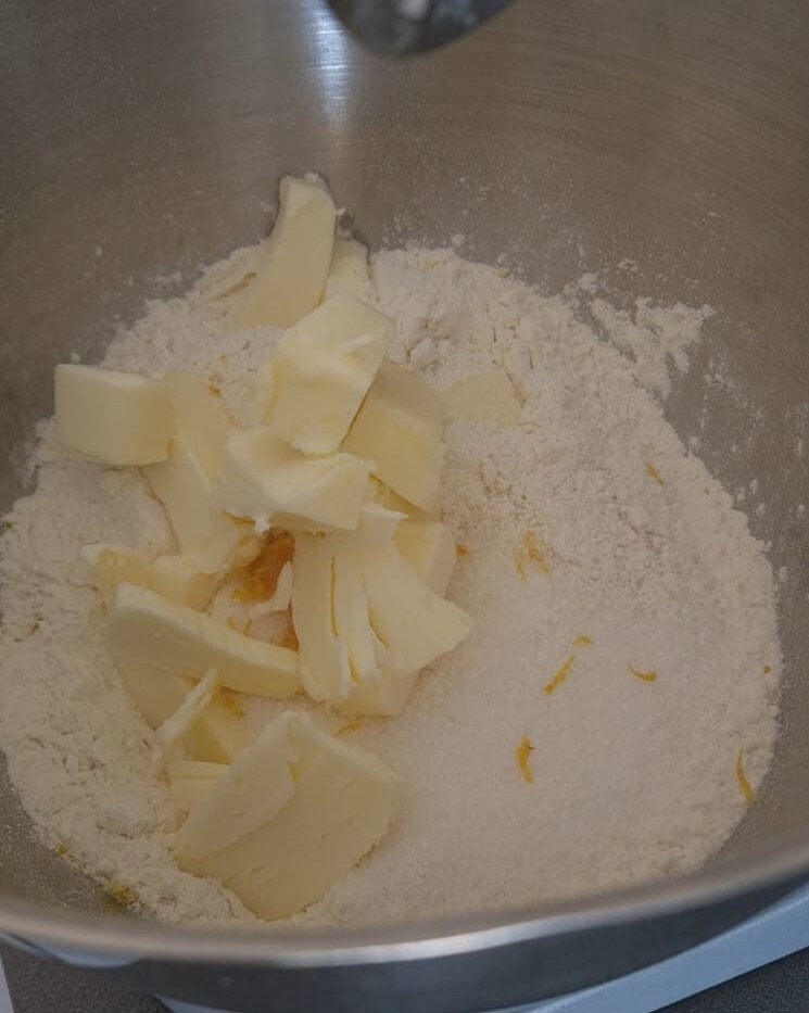 In een keukenrobot meng je de bloem, de suiker, de eieren en de boter. Begin met kneden tot je een goed compact deeg hebt.