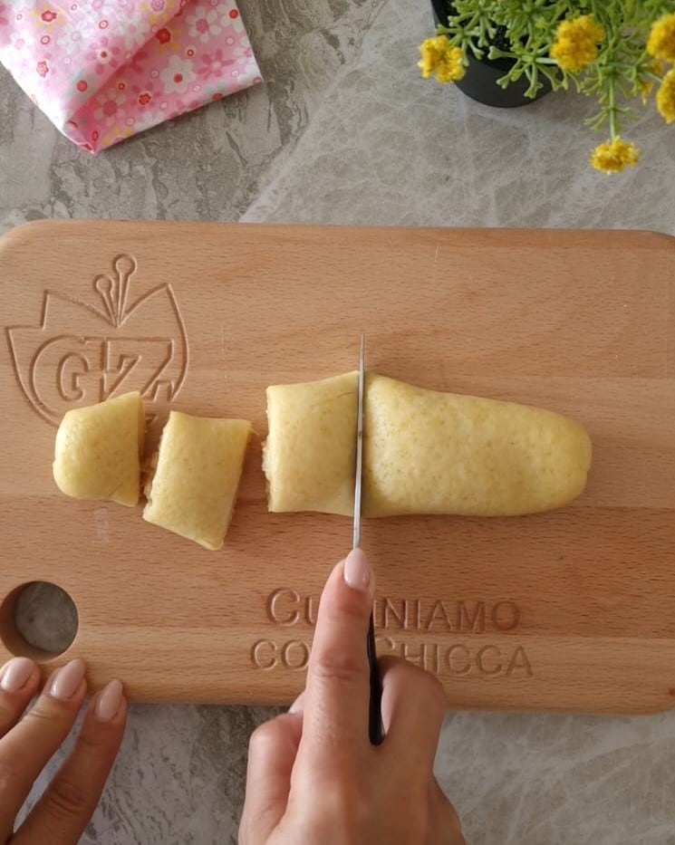 Herhaal dezelfde handeling voor de andere twee stroken deeg en met de overgebleven deegresten. Laat de rollen ongeveer 10 minuten in de vriezer rusten.