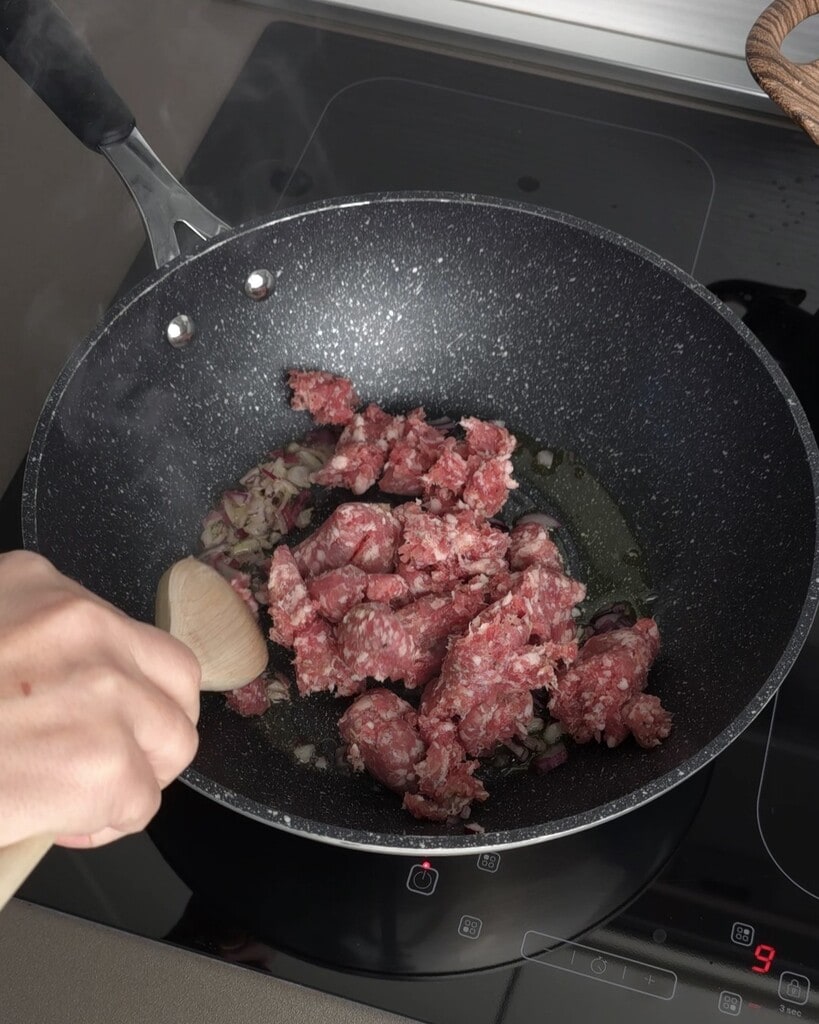 Voeg de verkruimelde worst toe en bak 5 minuten al roerend.