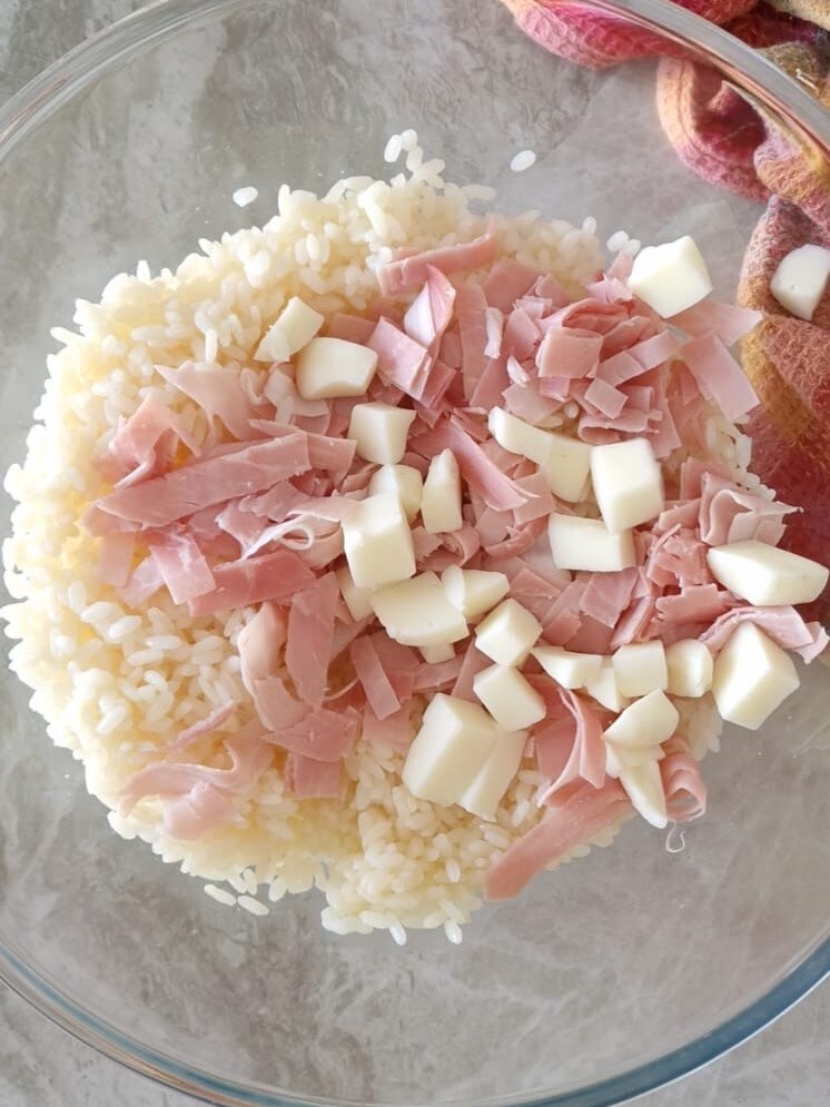Verplaats vervolgens de rijst naar een schaal voeg de gekookte ham en in blokjes gesneden scamorza toe.