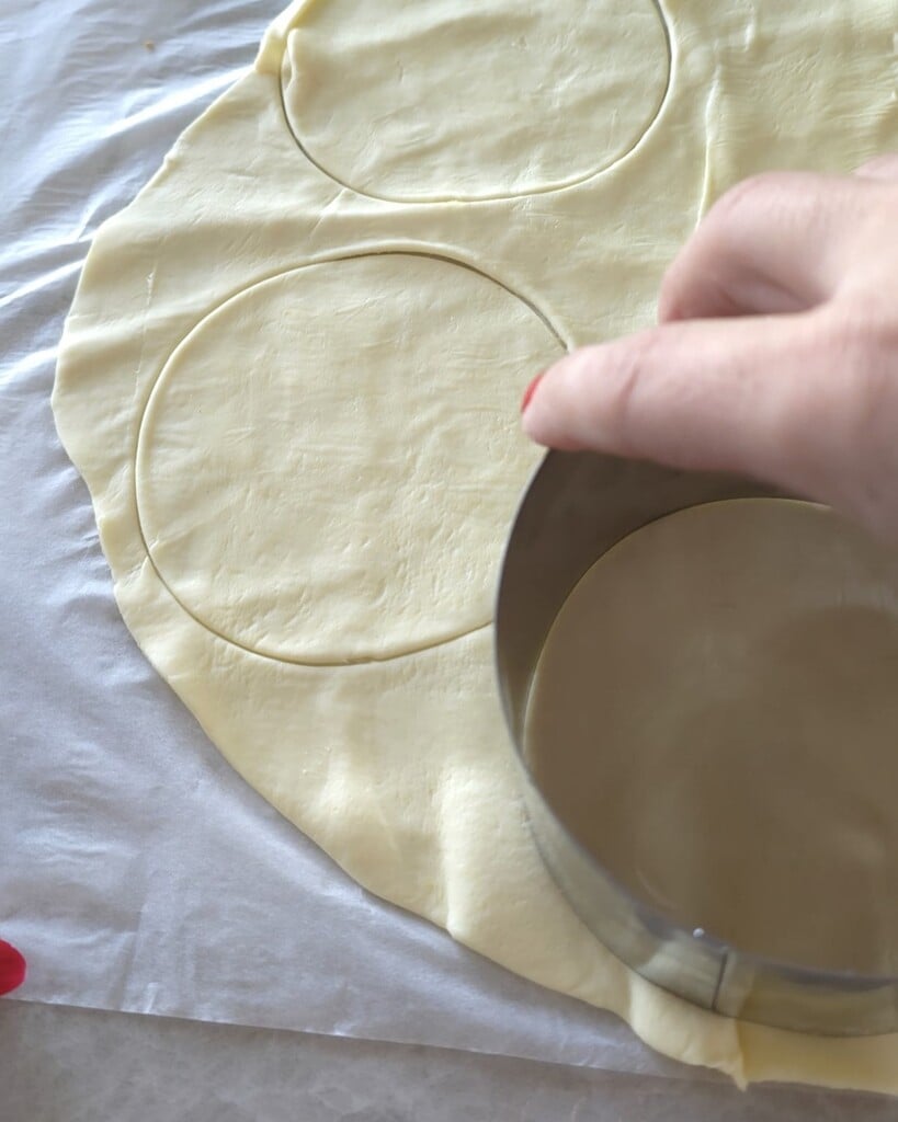 Om de paasmandjes te bereiden, begin met het uitrollen van het bladerdeeg en snijd het met behulp van een ronde uitsteker in zes cirkels. Kneed het resterende bladerdeeg opnieuw en snijd nog zes cirkels uit. (In totaal moeten er ongeveer 12 stuks uitkomen).