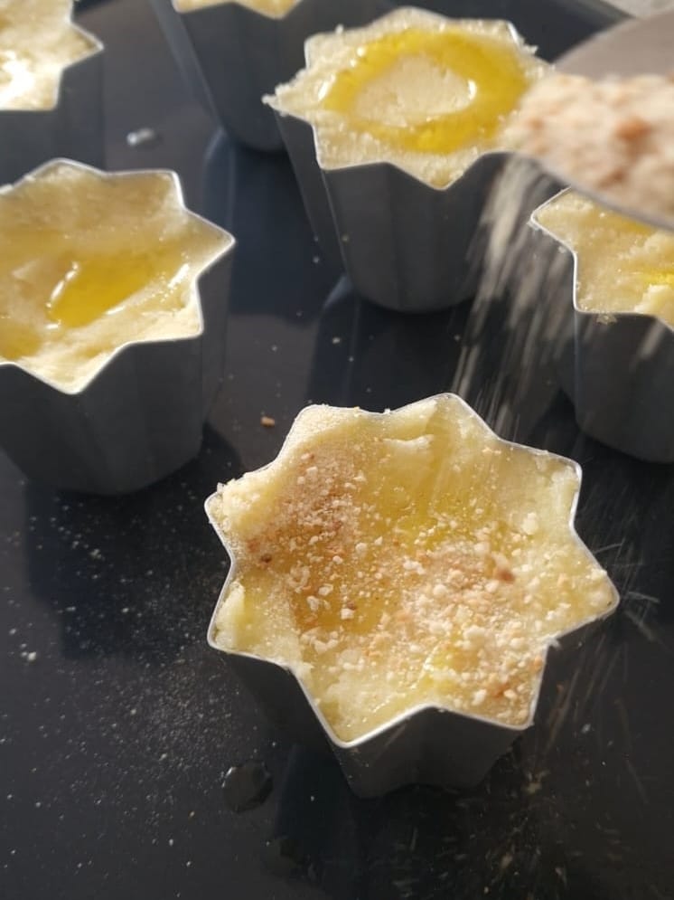 Zodra je een homogeen mengsel hebt gekregen, vet de pandorovormen in en bestrooi ze daarna met paneermeel. Vul de vormen om het taartje te vormen: schep beetje voor beetje het mengsel erin met een theelepel, druk het met de achterkant van de lepel op de bodem en de rand, laat ruimte in het midden om te vullen met een stukje kaas.