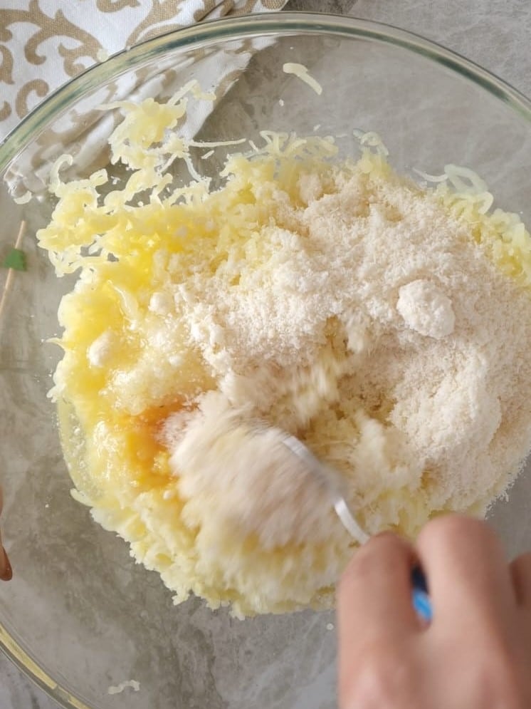 Voeg op dit punt zout, geraspte parmezaan en het ei toe.