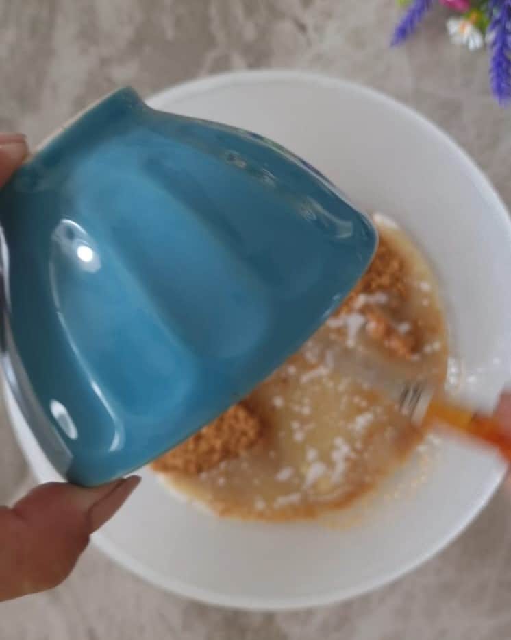 Begin met het verkruimelen van de koekjes met een mixer, voeg vervolgens de gesmolten boter toe en meng het geheel goed.