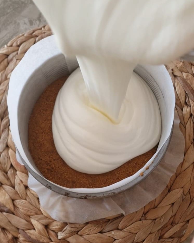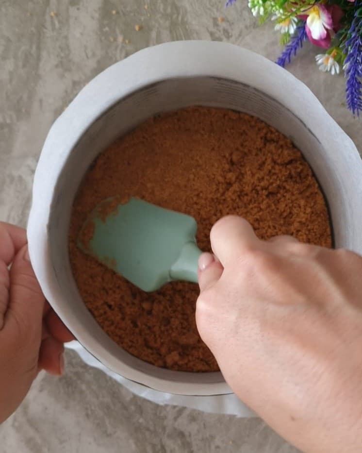 Giet de verkruimelde koekjes in de bakvorm van 18 cm en druk het mengsel goed aan met een lepel om zo je koekjesbodem te vormen, laat het vervolgens ongeveer een half uur in de vriezer rusten.
