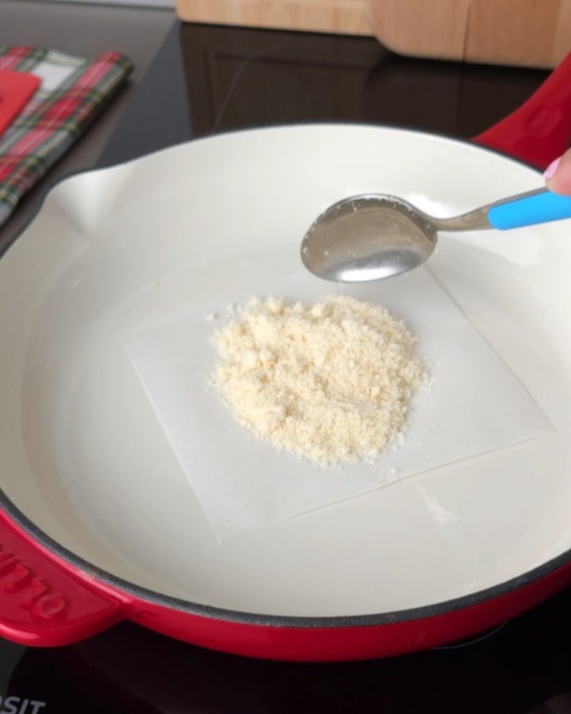 Leg een vierkant bakpapier in een pan, plaats vervolgens 3 eetlepels geraspte Parmezaanse kaas en verspreid met de achterkant van een lepel in een cirkelvorm.