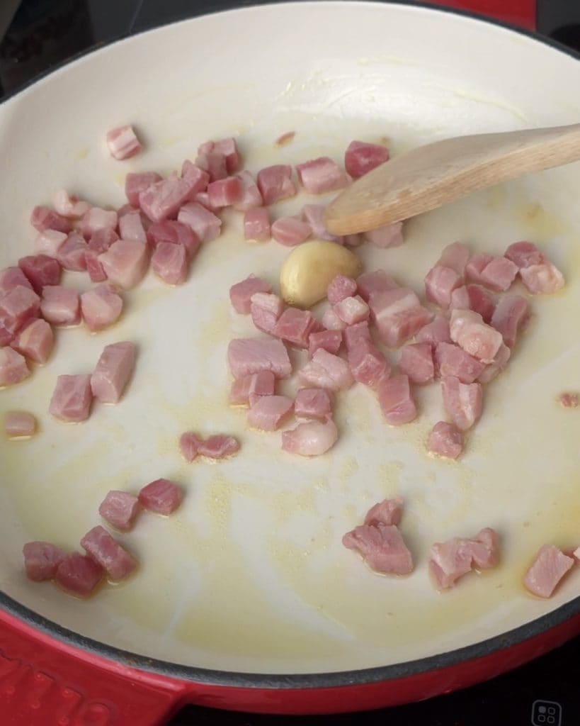Giet twee eetlepels olie en een teentje knoflook in een grote pan, daarna de spek en voeg de paddenstoelen toe, zout en bak 4 minuten.