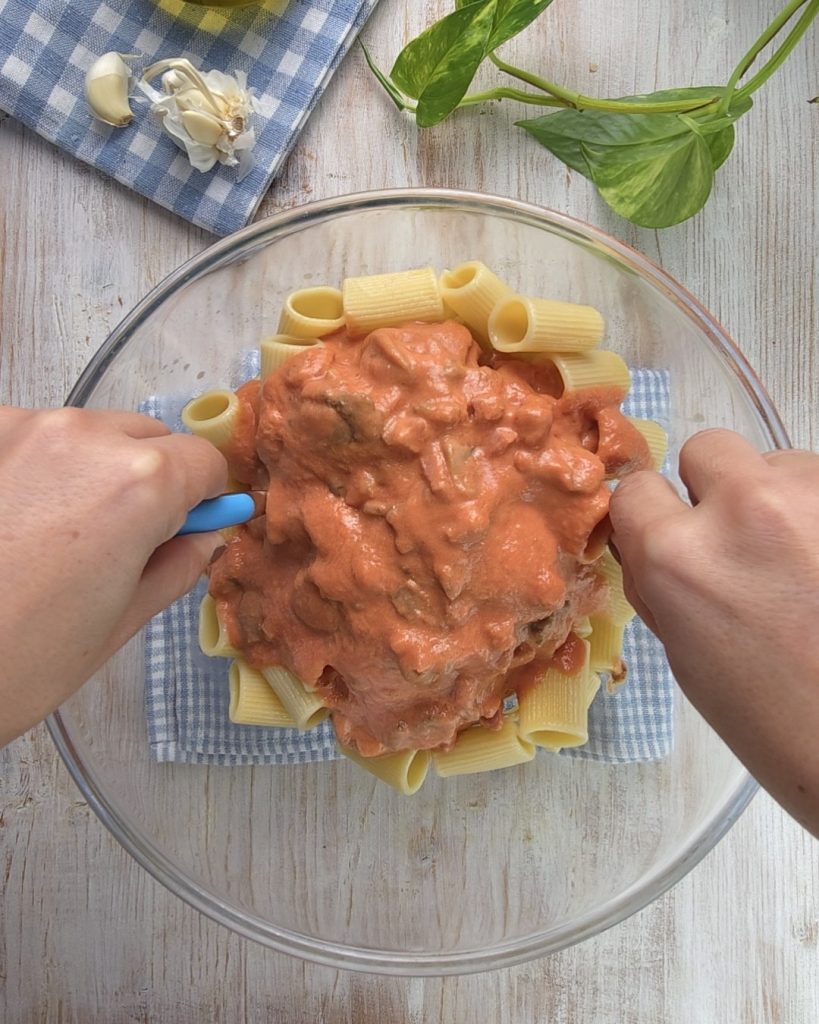 Breng de pasta op smaak met de bereide saus en slechts de helft van de mozzarella en meng goed.