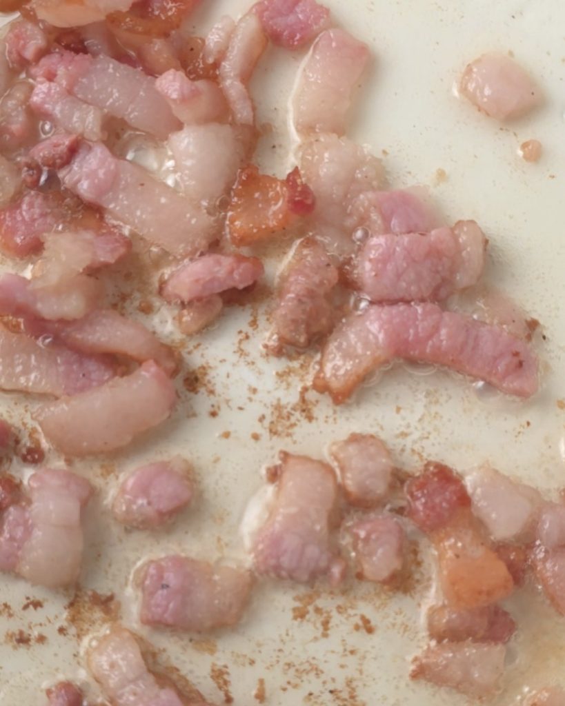 • Snijd ondertussen de guanciale in blokjes en bak deze in een anti-aanbakpan zonder extra vet.