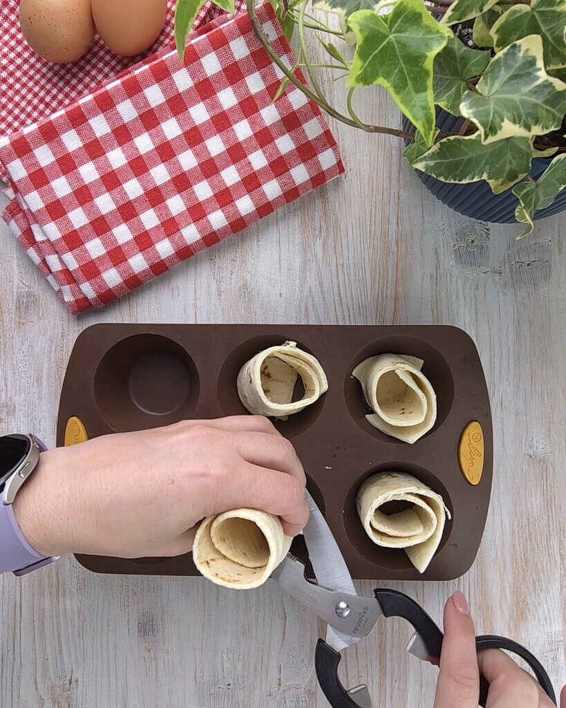 Plaats het vervolgens op siliconen muffinvormpjes en knip het op maat met een schaar. (In sommige vormen heb ik een basis met de piadina geplaatst, maar dat is niet essentieel).