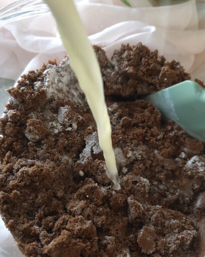 Giet de melk beetje bij beetje erbij en roer geleidelijk met een spatel.