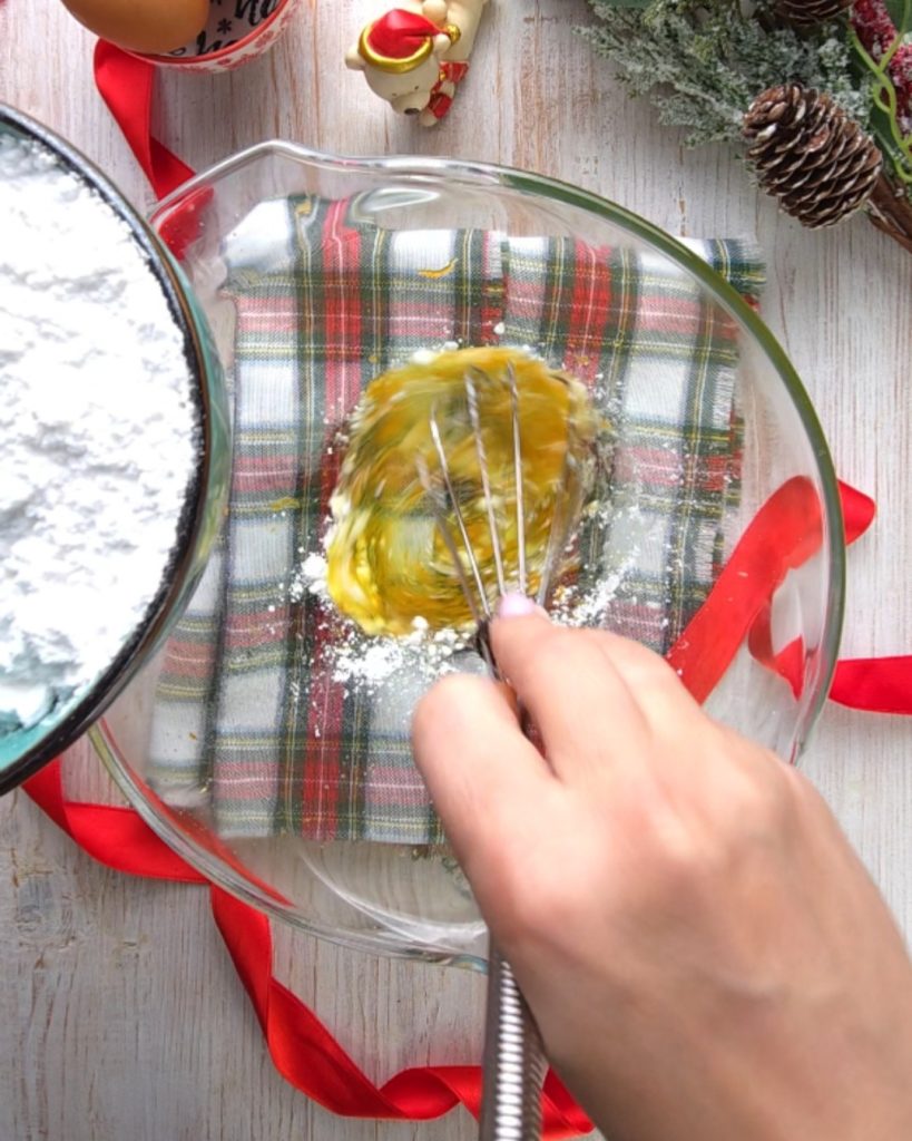 In een kom meng je de eiwitten, de sinaasappelschil, de amandelaroma en meng alles met een garde.