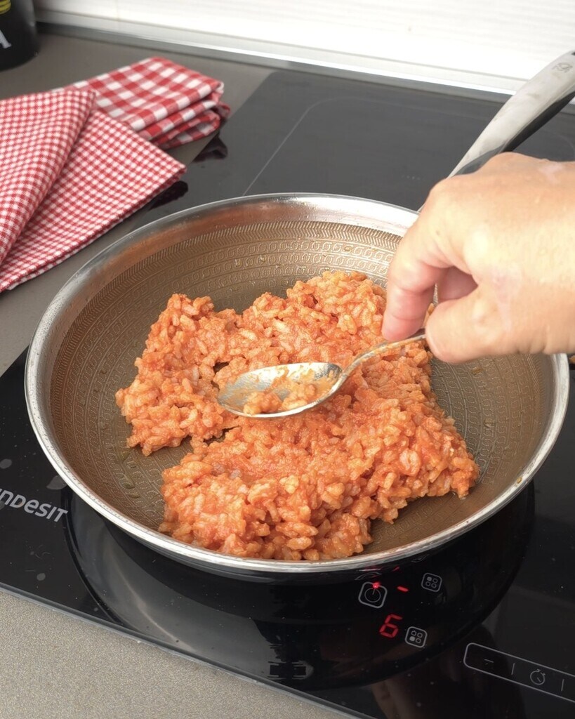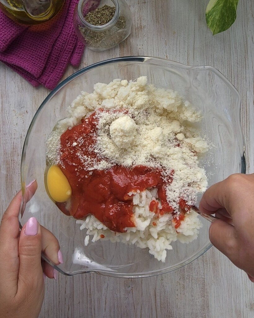 Voeg daarna in een kom de rijst, de tomatensaus, het ei, de Parmezaanse kaas, een snufje zout en peper samen en meng goed.
