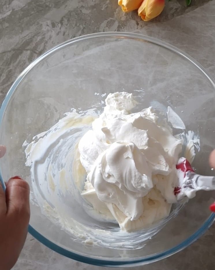 Roer de mascarpone met de poedersuiker, voeg vervolgens de opgeklopte room toe.