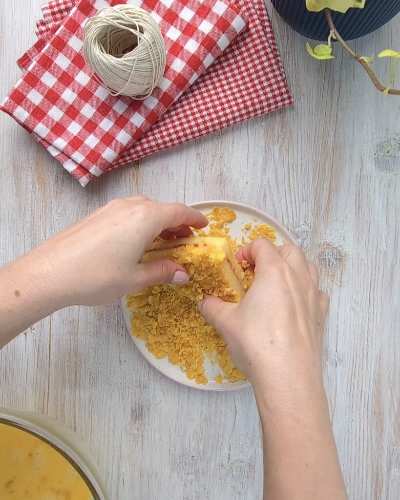Wanneer alle sandwiches klaar zijn, haal ze eerst door de losgeklopte eieren en vervolgens door de grofgehakte cornflakes.
