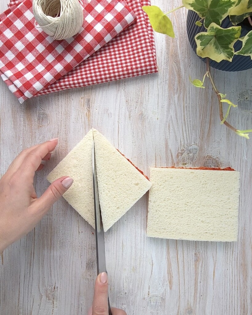 Sluit af met een andere plak en snijd het vervolgens eerst doormidden en daarna in vieren.