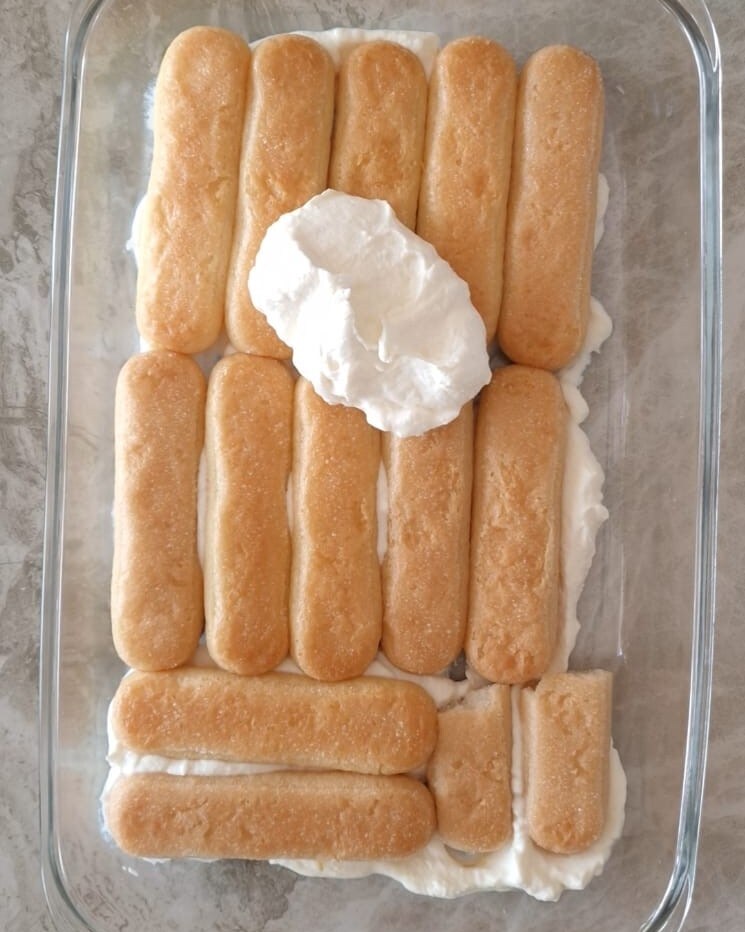 Dompel vervolgens de koekjes in de siroop en leg ze in een ovenschaal, afgewisseld met lagen koekjes en crème.