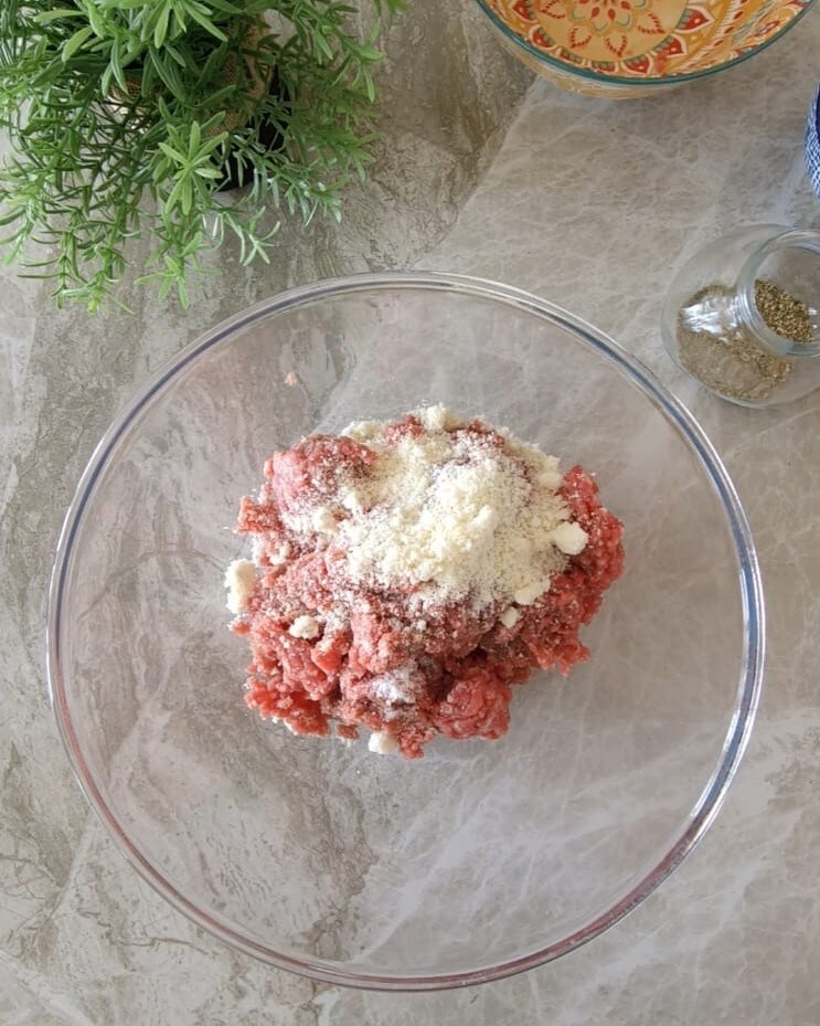 Begin met het plaatsen van het gehakt in een kom, breng op smaak met een snufje zout, knoflookpoeder, paneermeel en een scheutje melk.