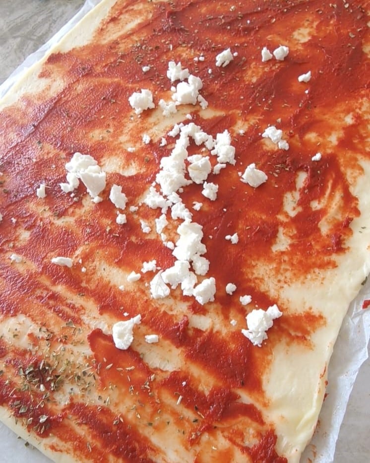 Rol het eerste pizzadeeg uit, vul het vervolgens met tomatenpuree en oregano.