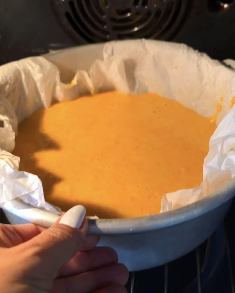 Giet het mengsel in een met bakpapier beklede vorm van 24 cm.