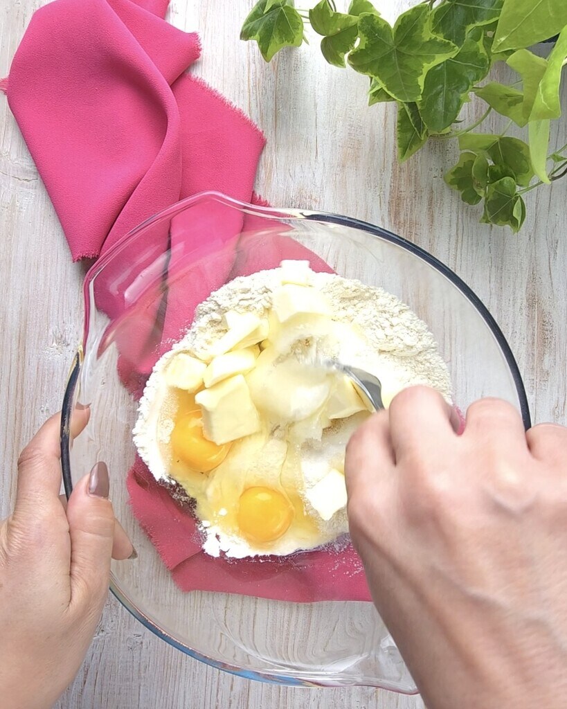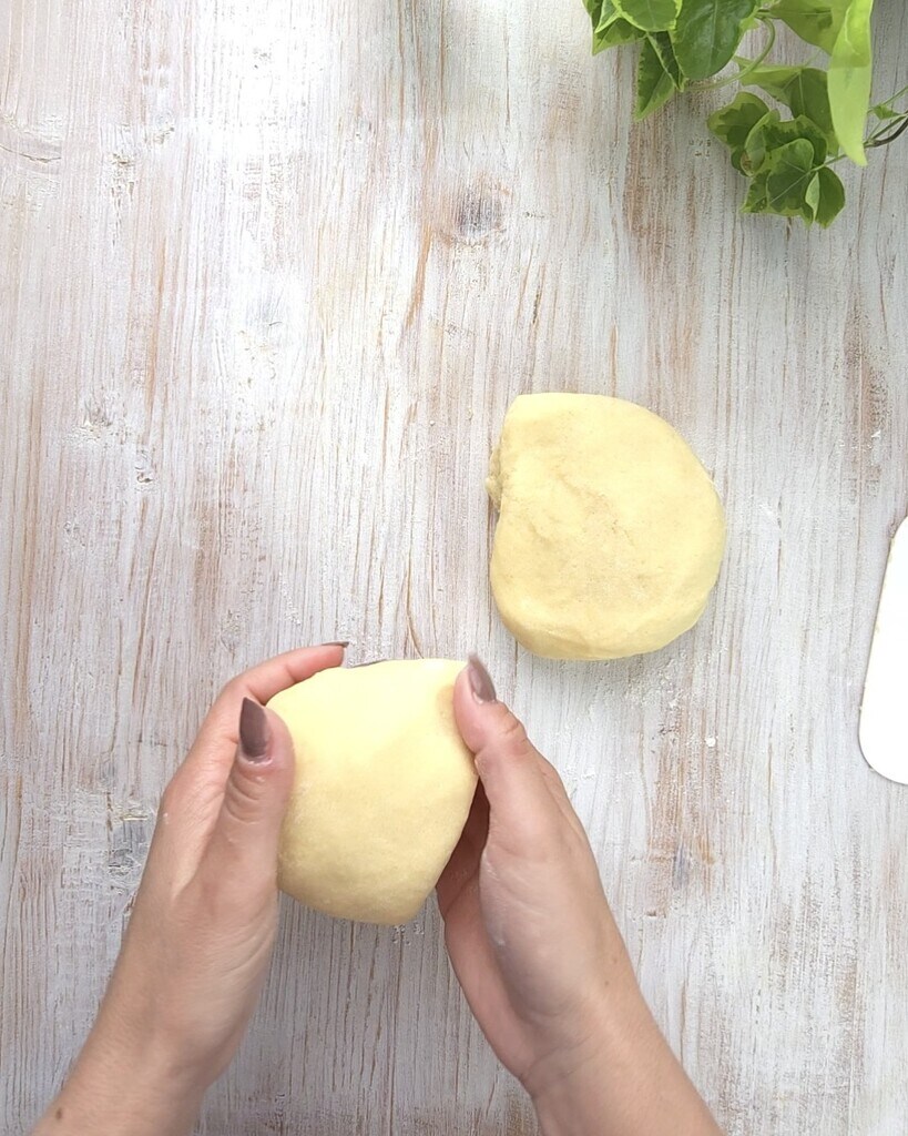 Zodra alles is samengevoegd, breng het over op het werkblad en werk het tot een zacht en compact deeg. Verdeel het deeg in tweeën en wikkel ze in huishoudfolie, laat ze 1 uur in de koelkast rusten.